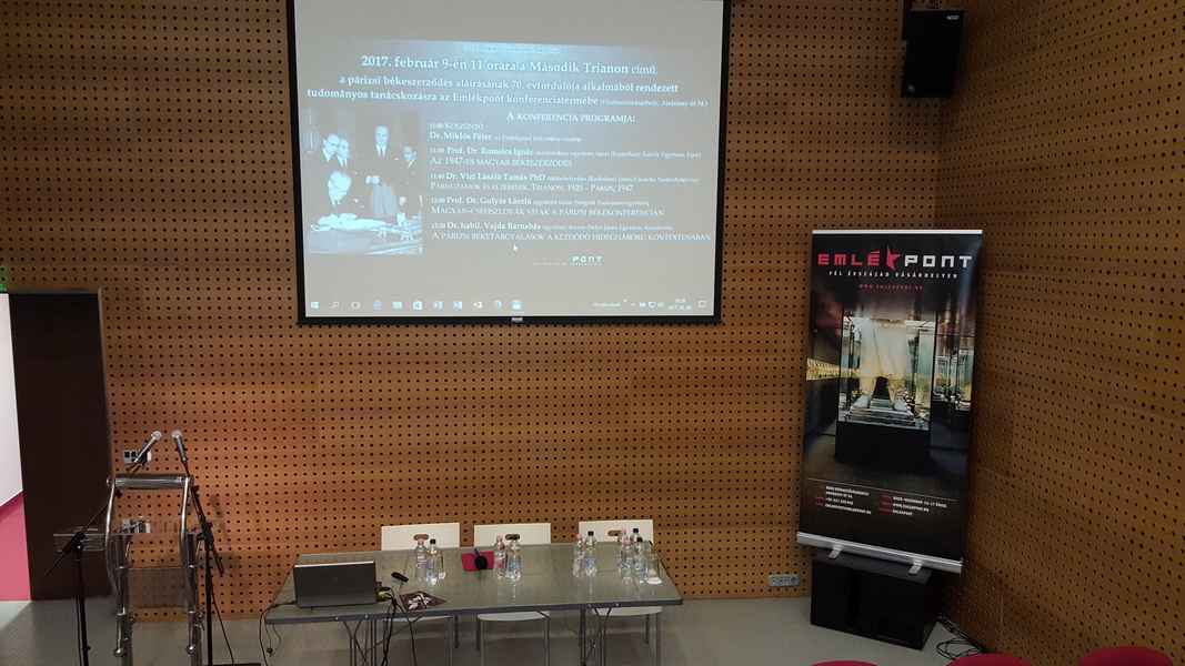 A hetven évvel ezelőtt, 1947. február 10-én aláírt párizsi békeszerződésről rendeztek konferenciát a jelenkorkutatással foglalkozó hódmezővásárhelyi Emlékpontban. Romsics Ignác akadémikus, Vizi László Tamás főiskolai tanár (Kodolányi János Főiskola) és Gulyás László professzor (Szegedi Tudományegyetem) mellett karunk Történelem Tanszékének docense, Vajda Barnabás is előadást tartott ,,A párizsi béketárgyalások a kezdődő hidegháború kontextusában” címmel. A képen az eladók és Miklós Péter, az Emlékpont igazgatója látható.