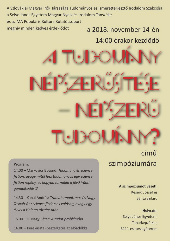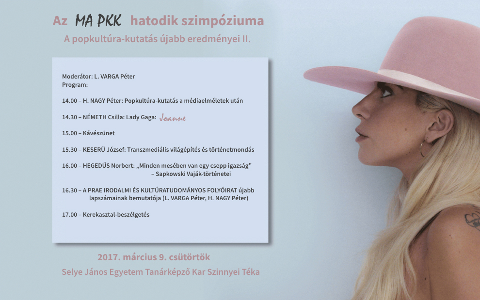 Értesítünk minden érdeklődőt, hogy az MA Populáris Kultúra Kutatócsoport ötödik szimpóziumára 2016. október 21-én kerül sor a Selye János Egyetem Tanárképző Karának kari olvasójában. A szimpózium témája: a popkultúra-kutatás újabb eredményei.