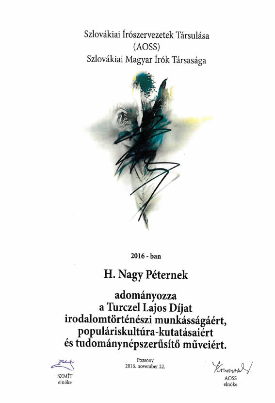 2016. november 22-én a Szlovákiai Magyar Írók Társasága Turczel-díjjal tüntette ki a Selye János Egyetem oktatóját, H. Nagy Péter. A tudományos tevékenységért járó H. Nagy Péter a populáris kultúra területén folytatott kutatásaiért és tudománynépszerűsítő műveiért érdemelte ki. A méltatásban elhangzott, hogy írásaiban a díjazott egyedülálló módon alkalmazza a humán tudomány és a természettudományok összekapcsolását, valamint eredeti módon műveli a popkultúra-kutatást.