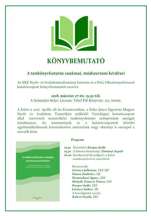 2018. március 27-én az egri Eszterházy Károly Egyetem Tittel Pál Könyvtárában az intézmény Nyelv- és Irodalomtudományi Intézete könyvbemutatót tartott. A rendezvény célja az volt, hogy a szélesebbközönséggel is megismertesse a 2017. április 28-án a Selye János Egyetem Magyar Nyelv és Irodalom Tanszékén működő Variológiai Kutatócsoport által szervezett nemzetközi tankönyvkutató szimpózium anyagát tartalmazó kötetet. Dr. Zimányi Árpád, az EKE BTK egykori dékánja és a Magyar Nyelvészeti Tanszék főiskolai tanára, először a Variológiai Kutatócsoport munkásságáról, illetve az EKE és az SJE szoros együttműködésének eredményességéről beszélt, majd a jelen lévő szerzők tanulmányaiból kiemelt legfontosabb gondolatok segítségével rámutatott a kötet elméleti és gyakorlati hasznára. A bemutatót kerekasztal-beszélgetés követte, amelyet Dr. Kalcsó Gyula, az EKE Magyar Nyelvészeti Tanszék docense vezetett. A rendezvényen meghívott vendégként részt vett Dr. Simon Szabolcs, az SJE Magyar Nyelv és Irodalom Tanszék tanszékvezető adjunktusa, valamint Dr. habil. Lőrincz Julianna egyetemi docens és Dr. Lőrincz Gábor adjunktus.