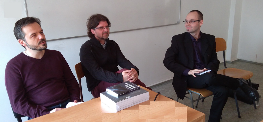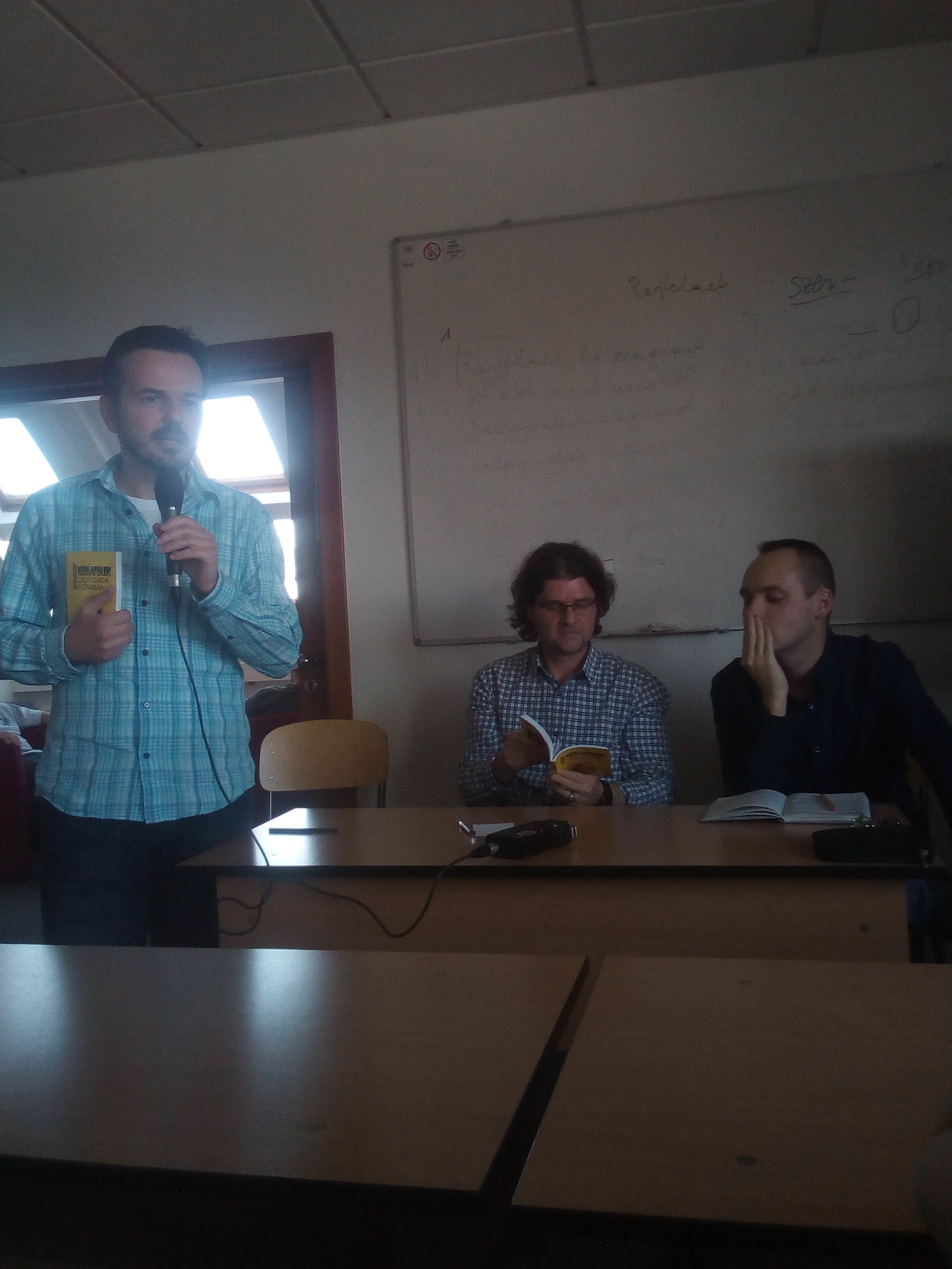 2017.10.16. Az MA Populáris Kultúra Kutatócsoport idei első könyvbemutatójára 2017. október 16-án került sor a Selye János Egyetem Tanárképző Karának kari olvasójában. H. Nagy Péter Médiaterek Lady Gaga korában című könyvét Keserű József mutatta be, majd ezt követően Baka L. Patrikkal közösen beszélgettek a szerzővel, mely beszélgetésről Rácz Vince készített rádiófelvételt. Keserű kiemelte, hogy a könyv egyedülálló teljesítménynek számít a kortárs magyar nyelvű irodalom- és médiaelméleti diskurzusban. A kötet borítója a kép és szöveg együttes játékán alapszik: ahogy a könyvtől távolodva a pixeles kép egyre élesebbé válik, akként kapunk egyre élesebb képet Lady Gaga művészetéről is, aki a kötet folyamán többször is átrendeződik. A Médiaterek módszertani szempontból szorosan kapcsolódik a szerző Alternatívák című könyvéhez azáltal, hogy egyes szövegrészek átemelődnek és új kontextusba helyeződnek, ezáltal pedig rekontextualizációról beszélhetünk. H. Nagy Péter korszerű eszközökkel közelít a populáris kultúra jelenségeihez, miközben nem csupán az irodalomra fókuszál, hanem egyedülálló módon kapcsolja össze a bölcsész gondolkodást és a természettudományokat, emellett pedig folyamatos kritikai gondolkodásra ösztönöz. Miután Keserű József részletesen bemutatta a könyvet, Baka L. Patrikkal közösen folytattak inspiráló és mélyenszántó, interdiszciplináris eszmecserét a szerzővel, melyben Lady Gaga művészetének megközelítésein túl szó esett a kétpólusú popkultúráról, a populáris irodalom mediális és intézményes szempontjairól, Barthes-ról, Kittlerről, Bacigalupi-ról, Darwinról és még Petőfi Sándor ubikvitásra épülő médiastratégiájáról is. Az emelkedett hangú kötetbemutatót egyetemünk rektora, Juhász György is megtisztelte jelenlétével.