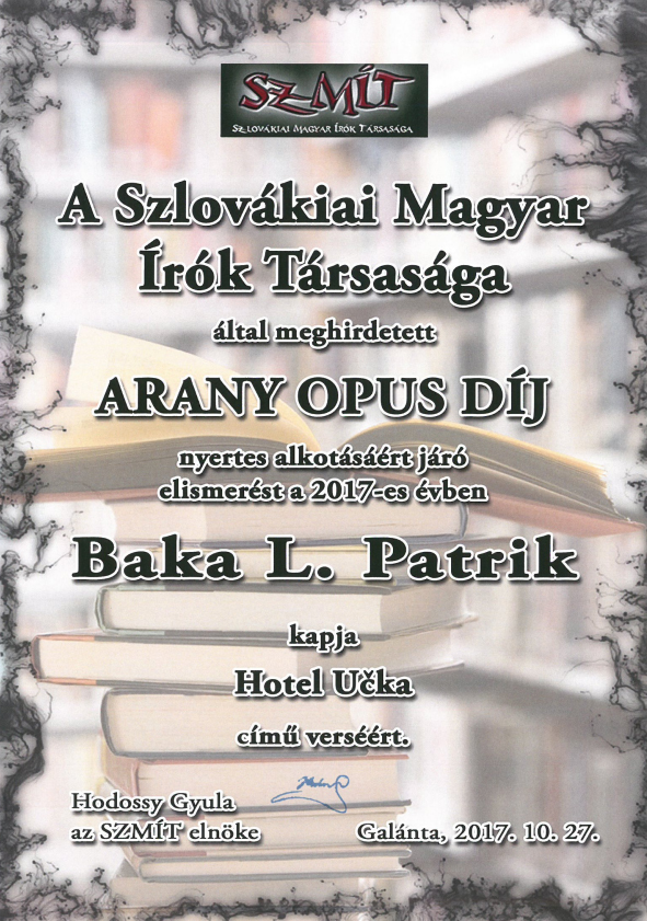 A Szlovákiai Magyar Írók Társasága (SzMÍT) 2017. október 27-én Galántán a XII. Őszi Írófesztivál keretében hirdette ki az idei Arany Opus Díj szépirodalmi pályázat győzteseit. A neves irodalmárokból álló zsűri: Grendel Lajos Kossuth-díjas író, Mizser Attila Madách-nívódíjas költő és Szászi Zoltán Talamon-díjas író, a vers kategóriában Baka L. Patriknak, az SJE Tanárképző Kar Magyar nyelv és Irodalom Tanszék doktoranduszának ítélte oda a díjat Hotel Učka című költeményéért. Gratulálunk!