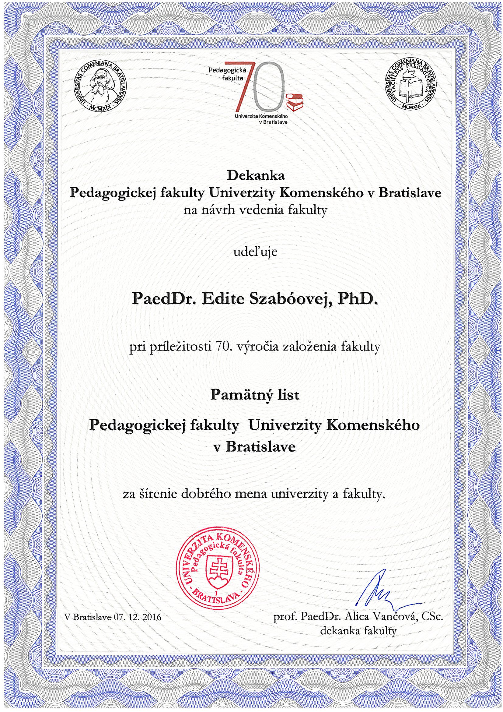 Pedagogickej fakulty Univerzity Komenského v Bratislave za šírenie dobrého mena univerzity a fakulty.