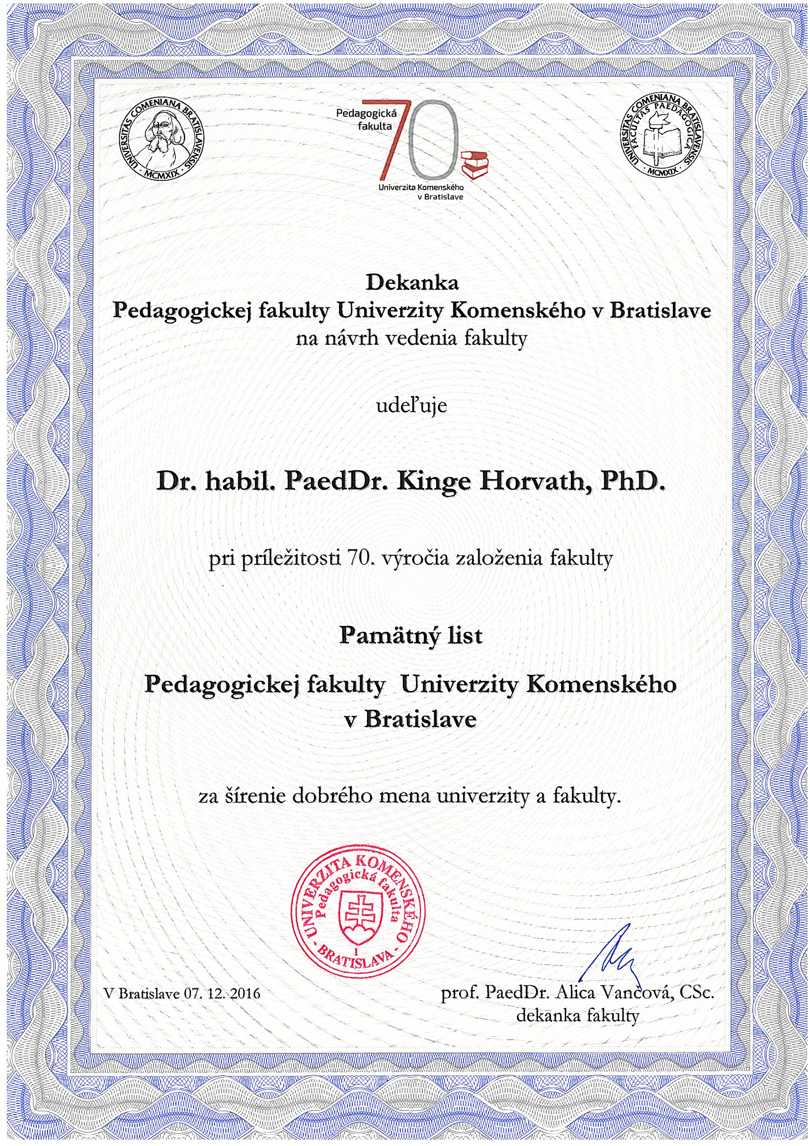 Pri príležitosti osláv 70. výročia založenia Pedagogickej fakulty Univerzity Komenského v Bratislave bol Dr. habil. PaedDr. Kinge Horváth, PhD. – dekanke Pedagogickej fakulty Univerzity J. Selyeho a PaedDr. Edite Szabóovej, PhD. – členke Katedry predškolskej a elementárnej pedagogiky Pedagogickej fakulty Univerzity J. Selyeho udelený